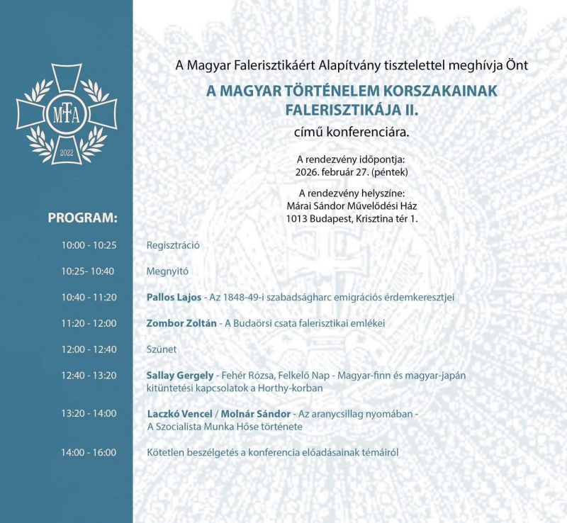 Mindenkit szeretettel várunk a a Magyar Falerisztikáért Alapítvány II. Konferenciájára. Részletek az alábbi eseményen: https://www.facebook.com/share/1BrXySQUzc/?mibextid=wwXIfr